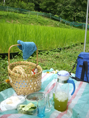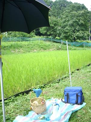 昨日は畑で、今日は田んぼで。草取り途中のティータイム。