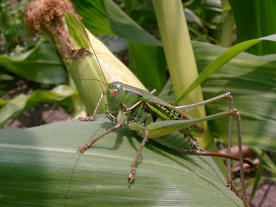 写真は雑草だらけの畑を前にしたラッキー君。右はトウモロコシの葉にいたバッタ