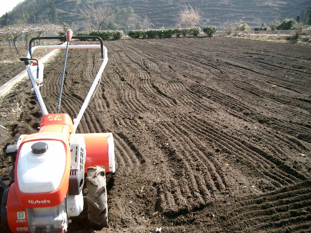昨年の落ち葉を堆肥にしておいたので、それを畑に撒いて、耕運機ラッキー号で耕し作業。
