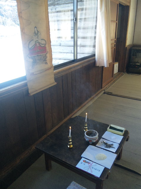 昔から伝わる掛け軸を掲げ、お線香をたいて祭る。